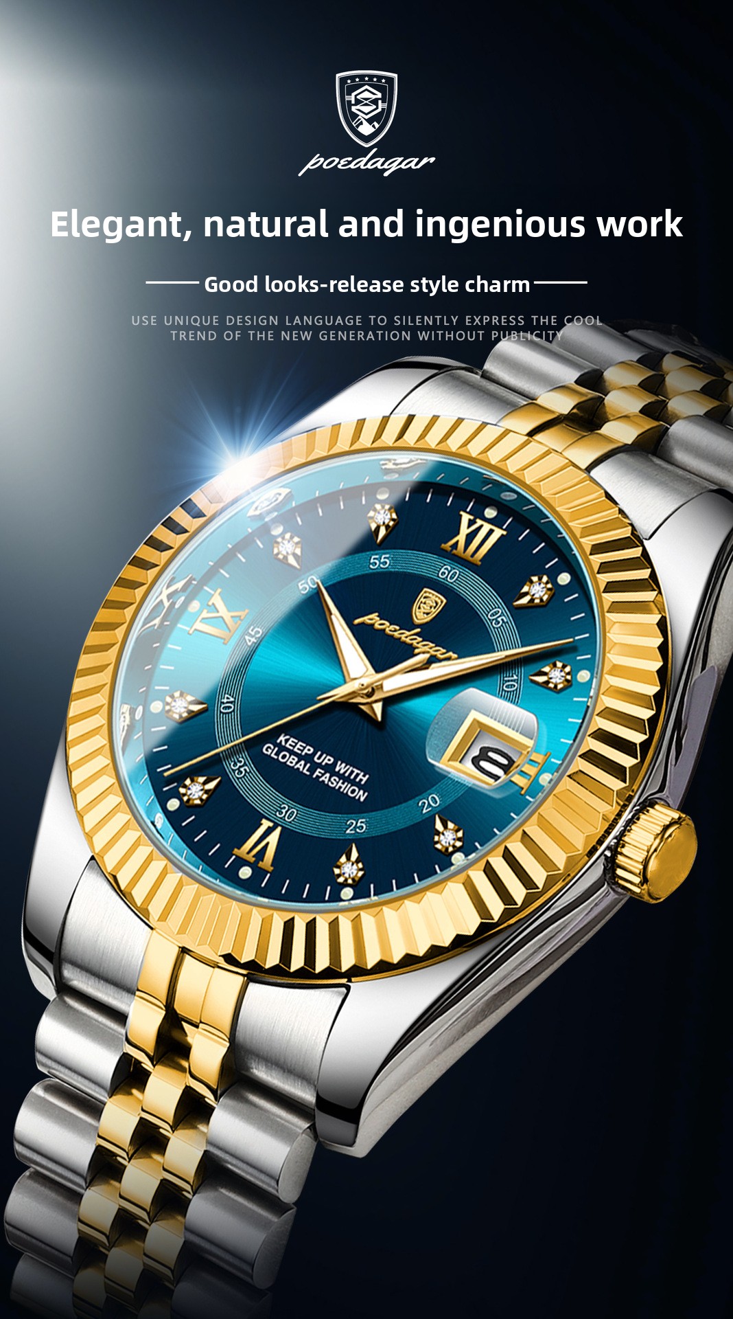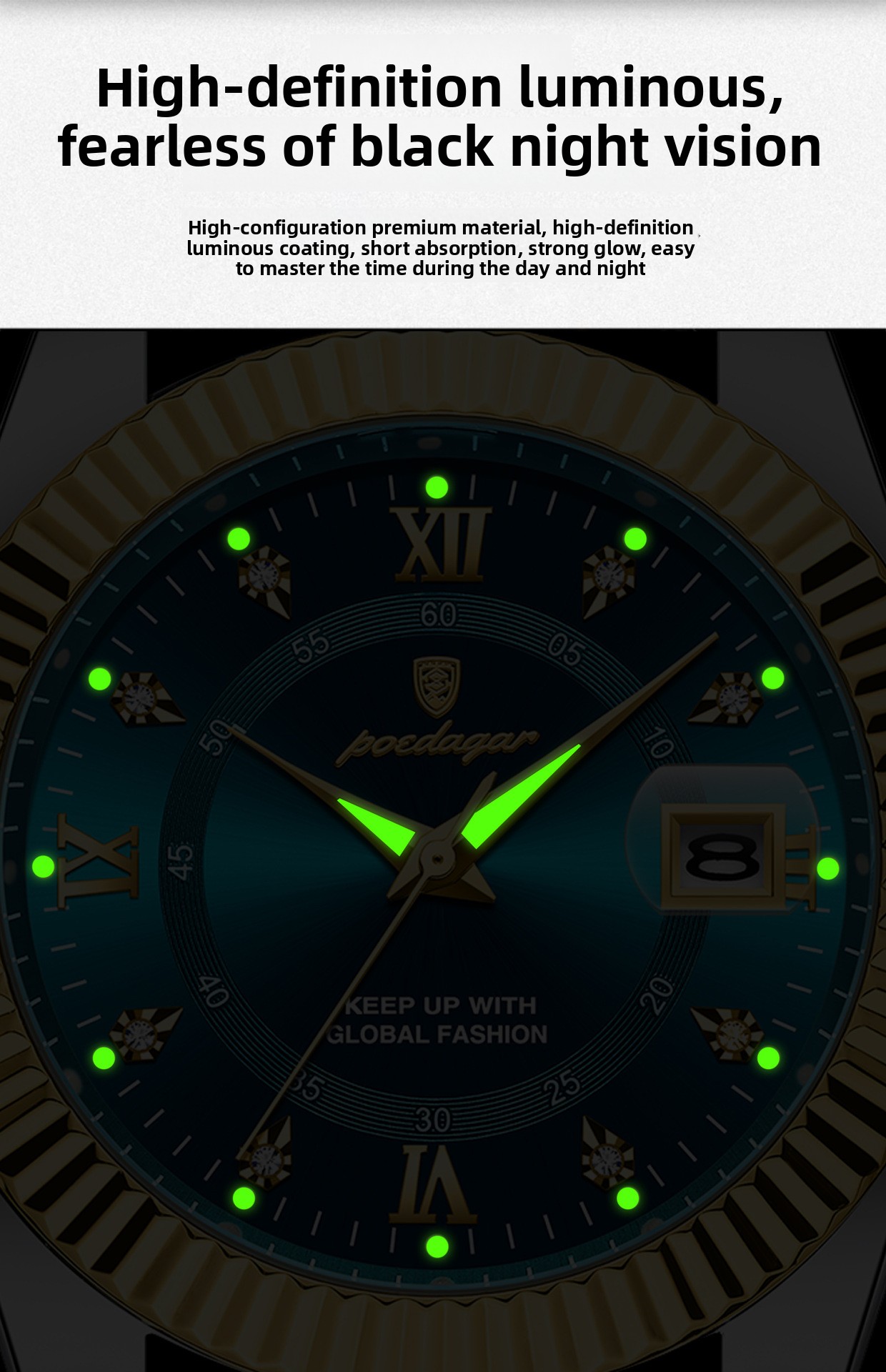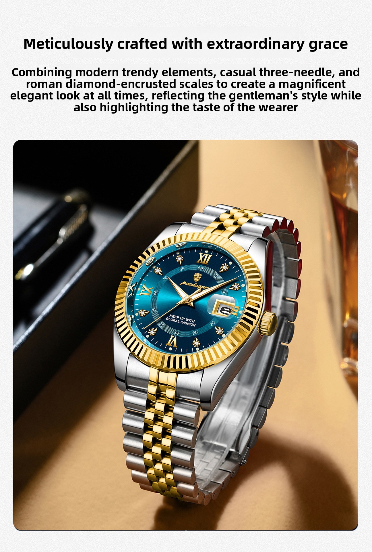 Multi-functional: Features date calendar, luminous hands, and decorative elements