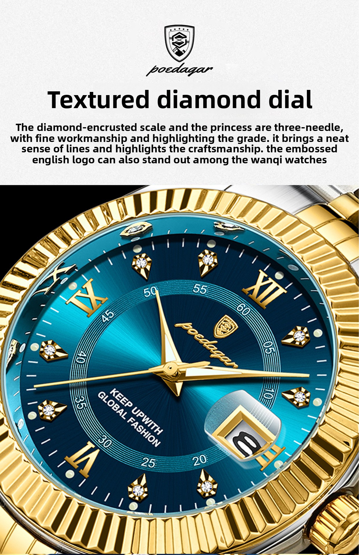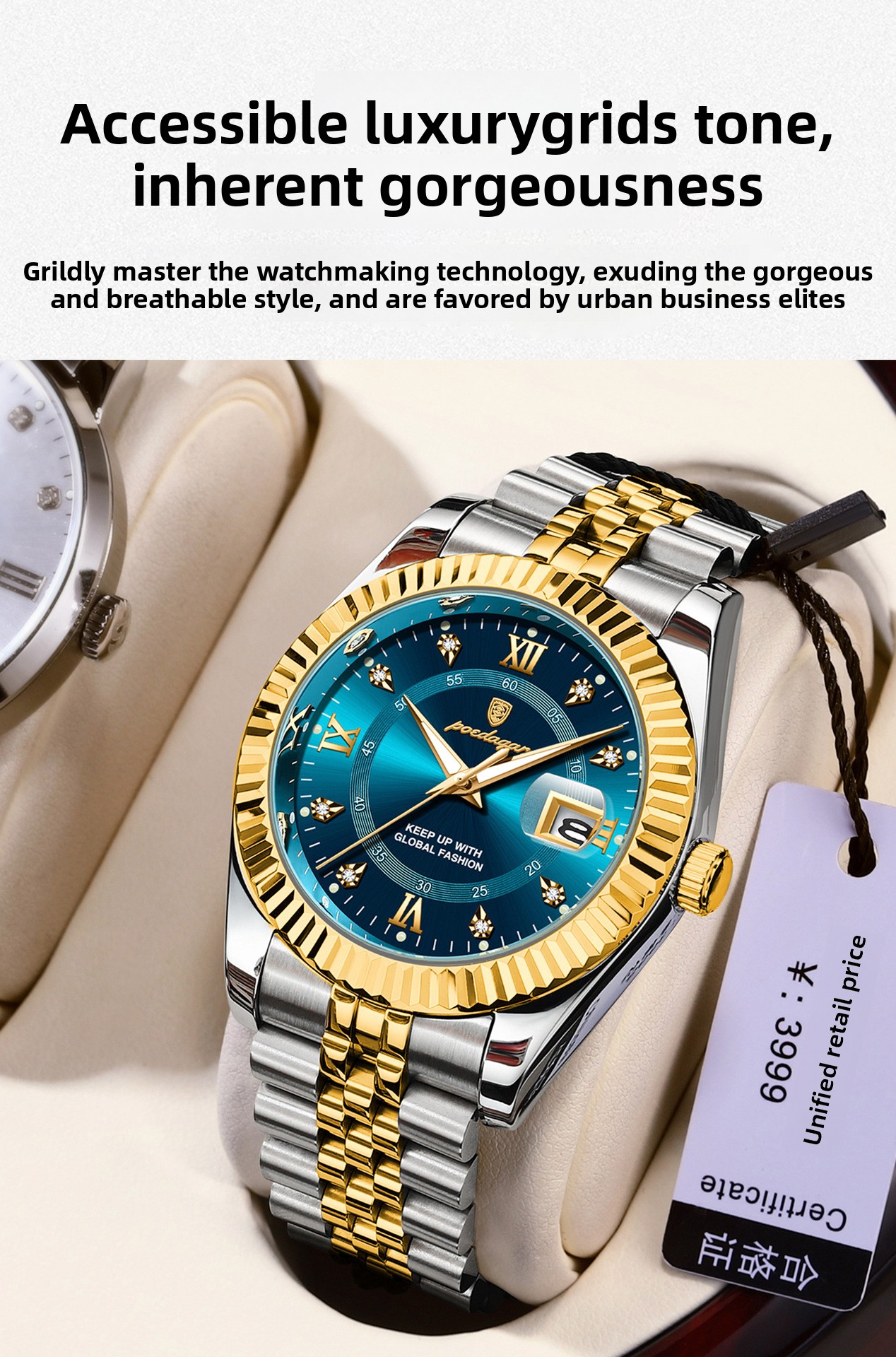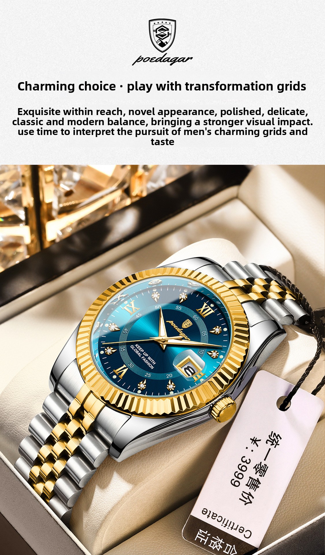 Multi-functional: Features date calendar, luminous hands, and decorative elements